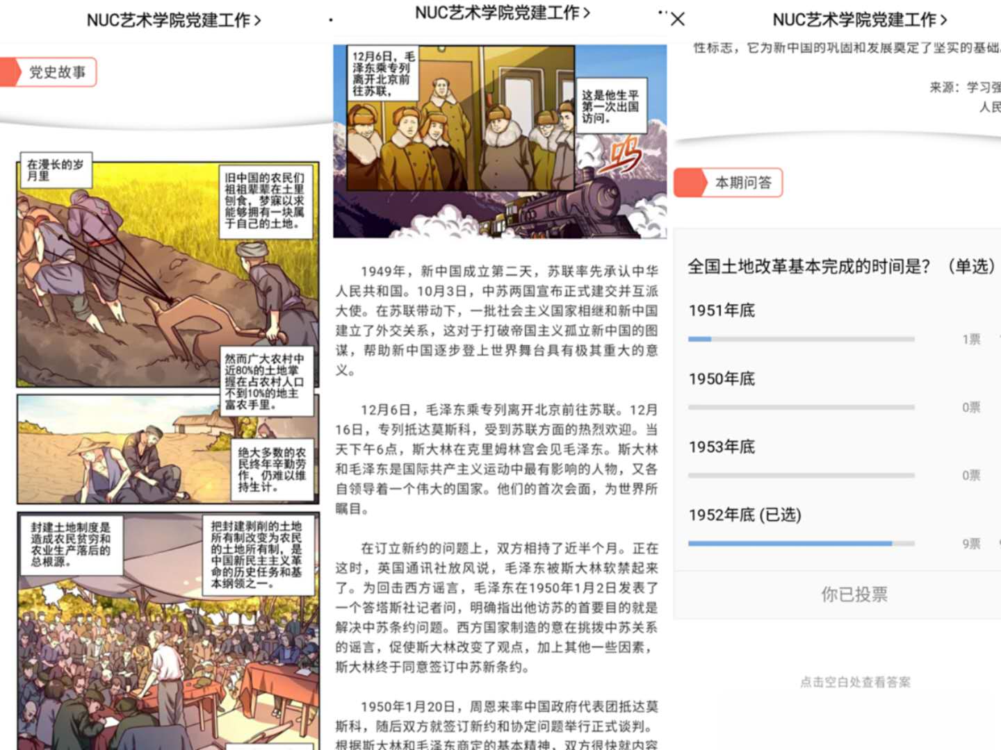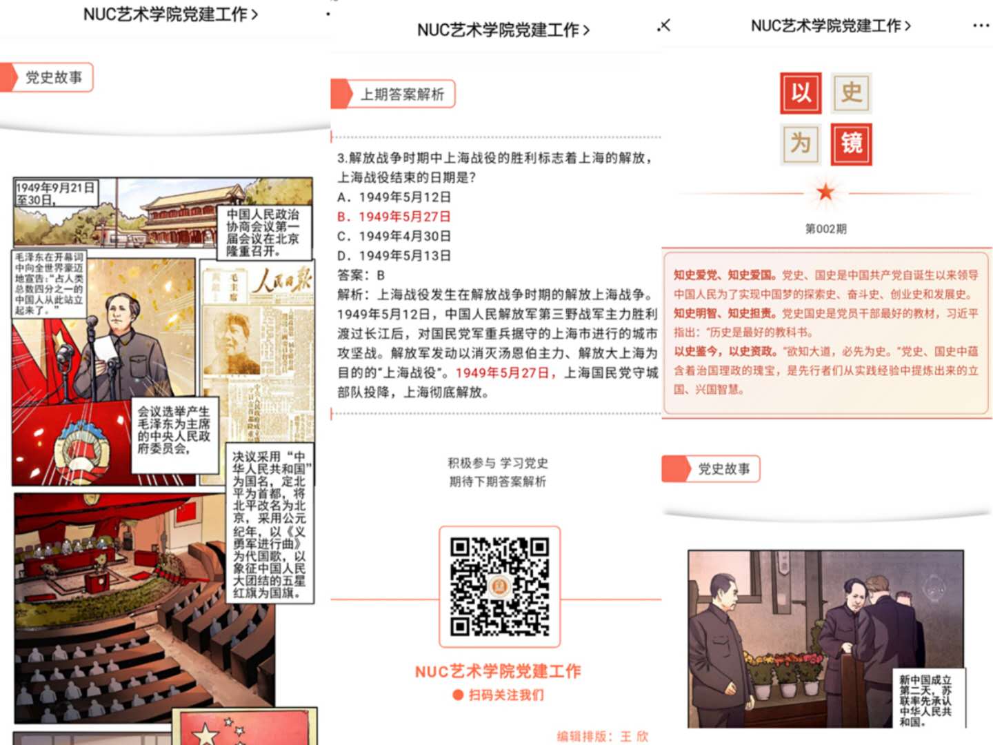在此次抗击突如其来的新冠病毒肺炎疫情的斗争中,我们切实感受到了全国广大党员干部在党中央的坚强领导下,不忘初心、牢记使命,挺身而出、英勇奋斗,团结带领广大人民群众打响抗疫之战,充分彰显了党的政治领导力、思想引领力、群众组织力、社会号召力。为进一步弘扬中国共产党的光辉历史,增强党员的历史文化修养,坚持学院党课“停课不停学”,本科生党支部推出线上党史漫画连载《以史为镜——漫画新中国史》,以加强对党员积极分子的党性教育,在每期推送最后完成线上问答进而考察学生们的学习成果,同时也在疫情期间调动党支部的积极性、主动性与创造性,进一步增强学生党支部的凝聚力、向心力。