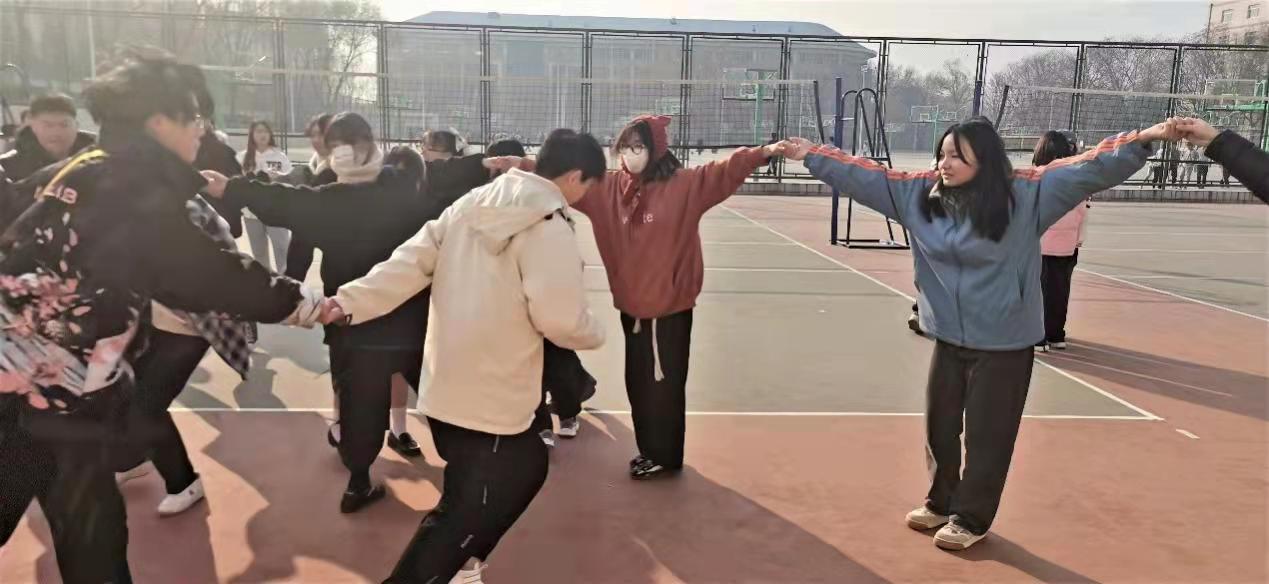 第二个游戏项目为【心有千千结】,学生们围成一个圈手拉手,放音乐开始自由走动,音乐停止后找到原来的人握住左右手,在手不放松的情况下解开这个结,这个游戏考验了同学们团结协作能力,使同学的默契增加。