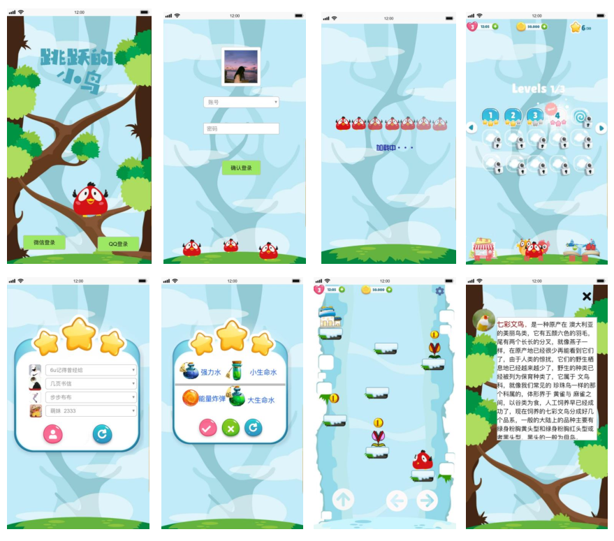 游戏界面设计说明:这是一款关于保护鸟类的益智类游戏。在游戏中,玩家通过帮助小鸟通过重重障碍,获取能量进行闯关。在游戏过程中,会不断有食人花、小怪物等来捣乱,玩家必须通过战胜它们获取能量值,才能进入下一关。每个关卡所需的能量值逐渐提高,根据通关之后获取的相应能量值可以在应用商店购买通关所需的物品(炸弹,生命水,强力水等)。在规定时间内得到规定的能量值,过关后会有一个商店,商品简介在柜台下方的平台里。可用QQ或微信登录和自己的好友共同闯关,提升自己的等级。