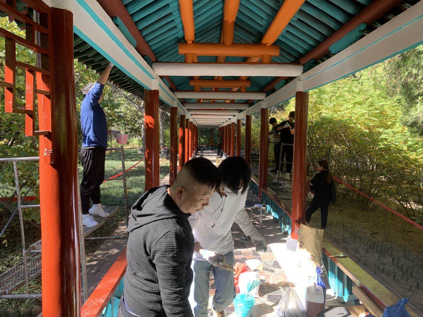 10月31日下午,杨正民处长与夏瑞丽书记分别带领相关负责同志及部分学生代表步行来到柏林园入口处共同参观长廊彩绘工作完成情况并进行了简短的剪彩仪式,此次长廊翻新工作由后勤管理处校园绿化中心具体负责,先后对廊体进行维修、加固、廊顶古砖修补及枯枝树叶的清理,并将长廊彩绘工作由艺术学院申旭栋老师负责,组织二十余名学生加班加点、精心描绘,用时13天时间将77米长廊全部彩绘完成,长廊彩绘效果整体简洁大方,枋粱上绘有山水、花鸟、风景图案,其线条细腻、形象逼真,极大地改善了长廊整体面貌,提高了柏林园整体美观效果,更好地为我校师生提供了学习、休闲、娱乐的好去处,为迎接我校80周年校庆和实现“百年百强”中北梦做出积极贡献。