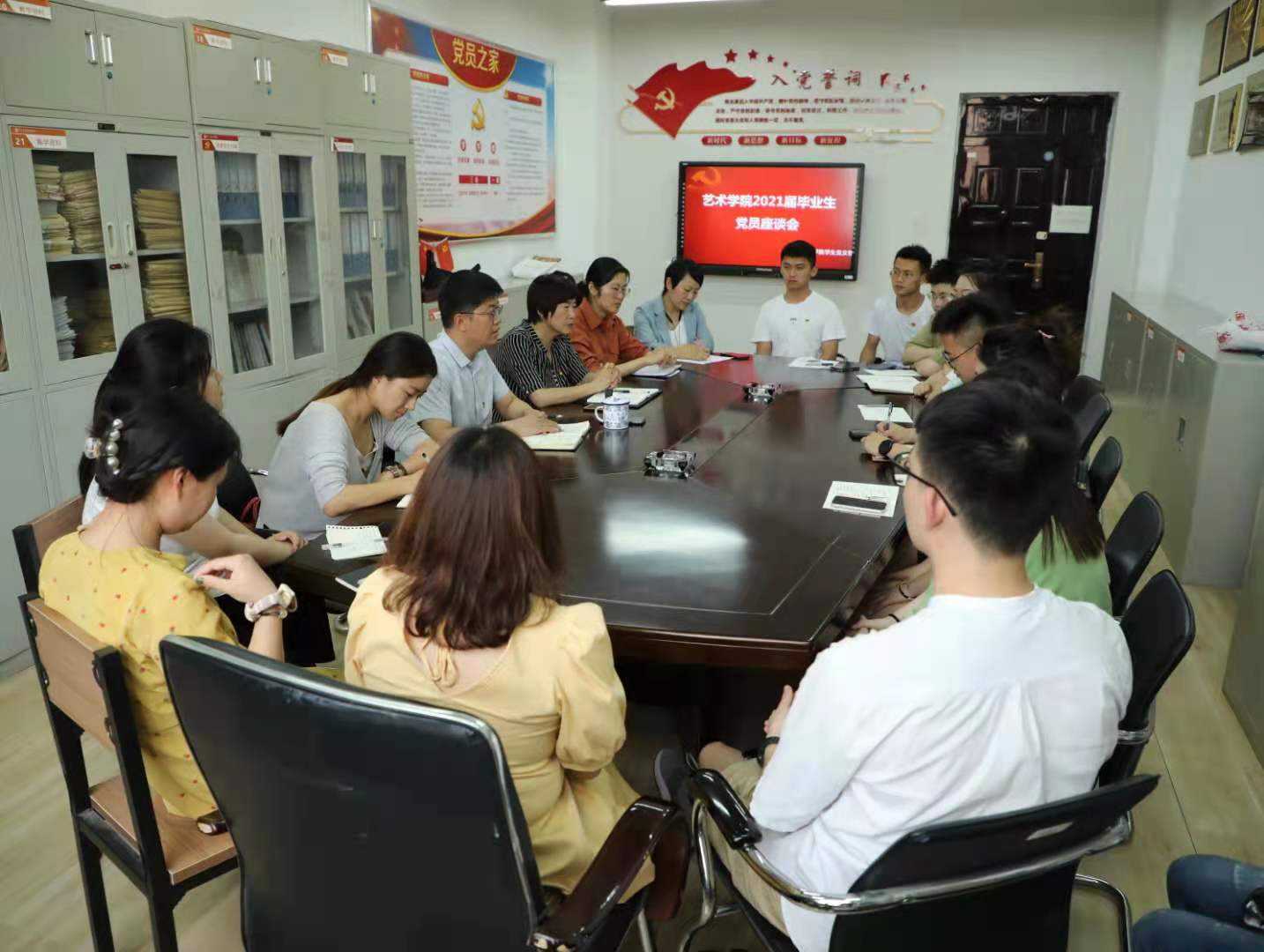 6月8日下午,艺术学院党委在521会议室开展2021届毕业生党员座谈会,学院党委书记夏瑞丽、副书记田维飞及学生支部书记夏志丽、刘维佳与来自学院各专业的毕业生15名党员代表进行了面对面交流。座谈会由院党委副书记田维飞主持。