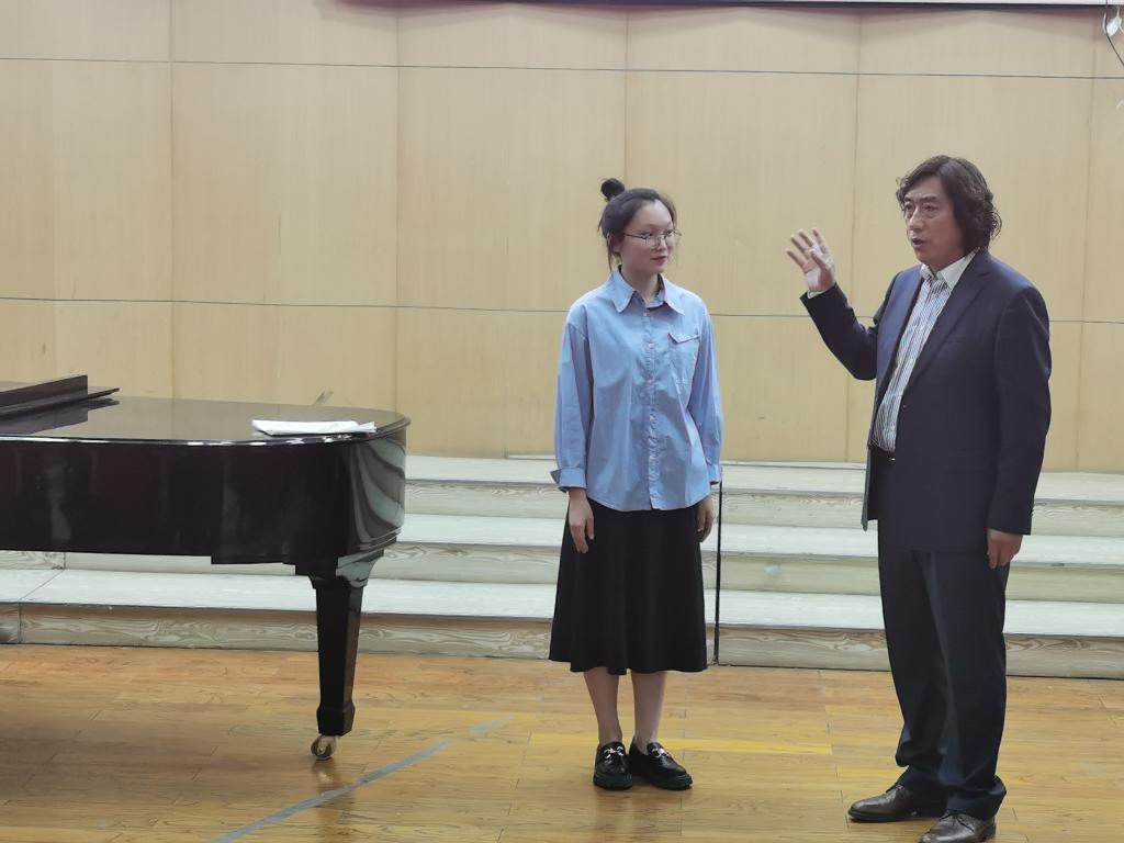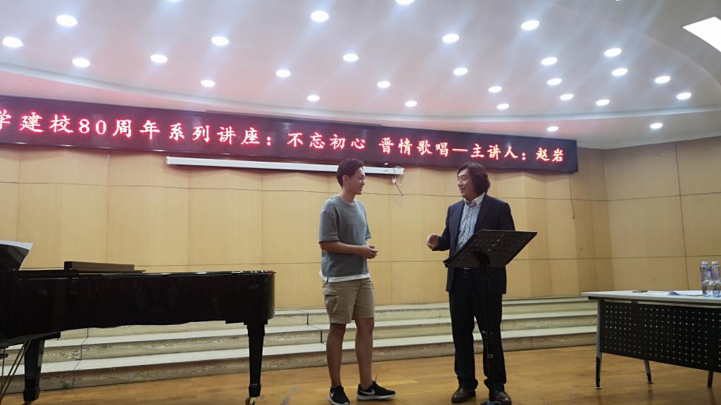 课堂上,赵老师风趣幽默的授课方式深受同学们的喜爱。他深入浅出的为大家认真示范发音方式,从细节入手纠正同学们的发音,强调建立正确的思想意识在声乐演唱技能训练的重要性,课堂中洋溢着诗与歌的轻松氛围。在赵老师深情演绎《草原上升起不落的太阳》《滚滚长江东逝水》中,本次讲座落下帷幕,但他那低沉醇厚温暖而富有磁性的声音,余音袅袅,不绝于耳。
