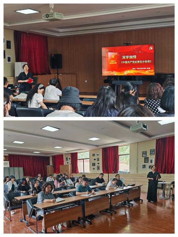 为深入学习贯彻习近平总书记关于党纪学习教育的重要讲话和重要指示精神,坚定理想信念,增强纪律意识,5月28日下午,艺术学院党委书记郭云霞同志以“深学细悟《中国共产党纪律处分条例》”为题开展党纪学习教育专题党课,学院领导班子及全院教工党员参加了学习。