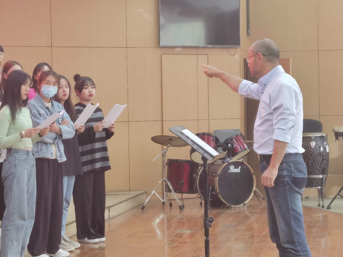 甘霖老师现场观看了我院合唱团排演《传承、跨越、融合》合唱音乐会部分作品,并进行了现场指导。甘教授就其中《雨中即景》、《夜来香》、《我爱你中国》、《BEAT IT》等多首曲子进行了专业指导,并提出了宝贵建议。他对每个段落处理要求仔细,对小节的逻辑重音要求严格。