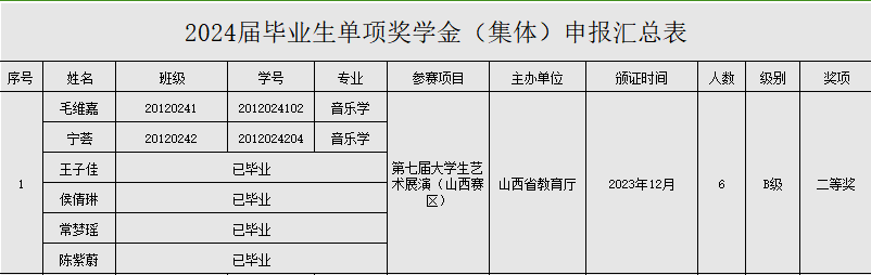 我院单项奖学金评定依照《中北大学大学生奖学金评定实施细则》(校学字[2020]第11号)有关规定已评审结束。经个人申请——班级审核——学院审查,2人获得个人创新创业实践和竞赛奖学金。现将名单公示在管网及文澜苑公示栏内,公示期3天,从2024年5月19日——21日。