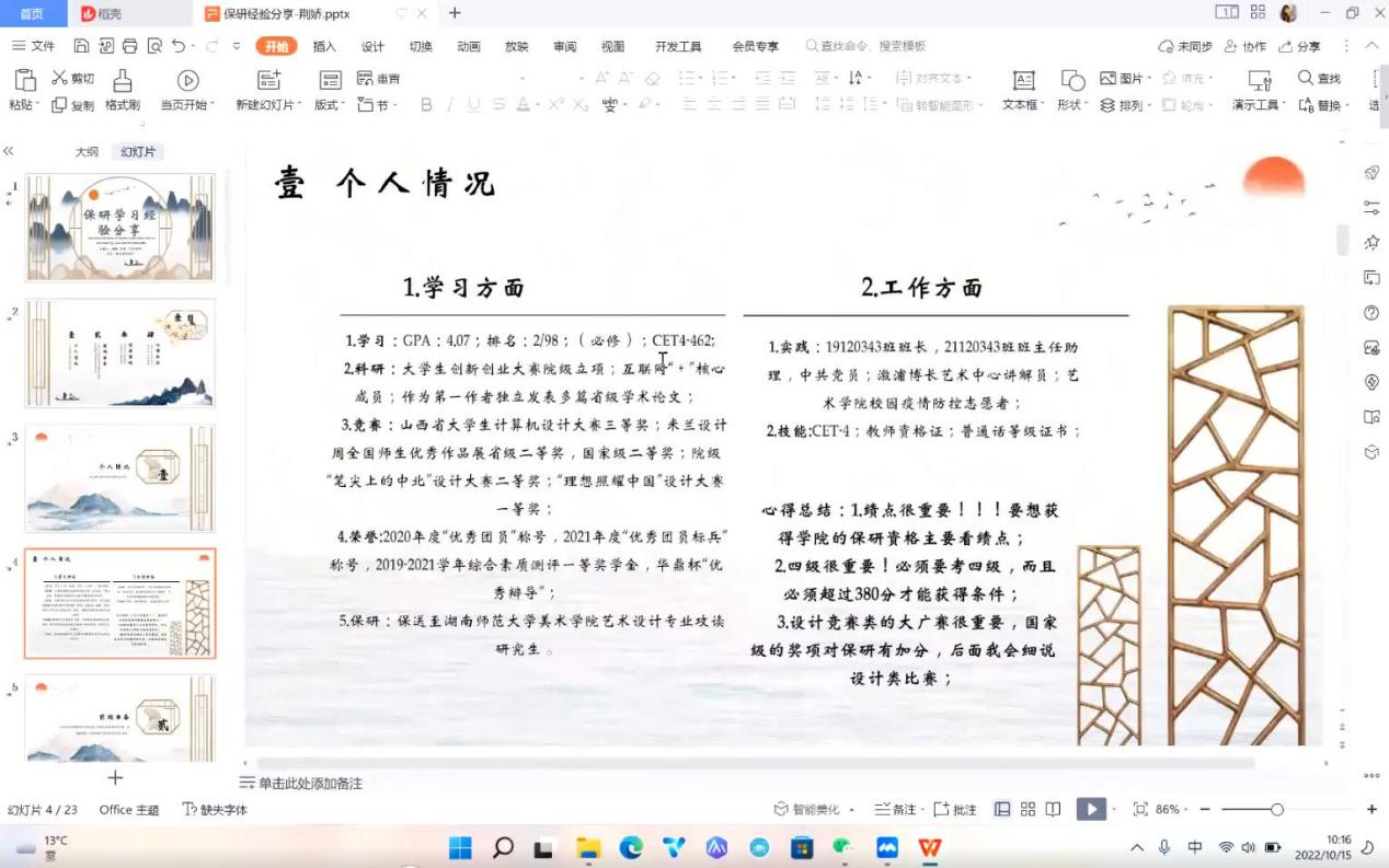 2022年10月15日上午九点在腾讯会议举办艺术学院学习经验交流会,此次学习经验交流会邀请了大四学习成绩名列前茅的同学进行交流与辅导。以此来帮助2022级新生更好的了解和适应大学的生活。2022级全体同学参加了此次活动。