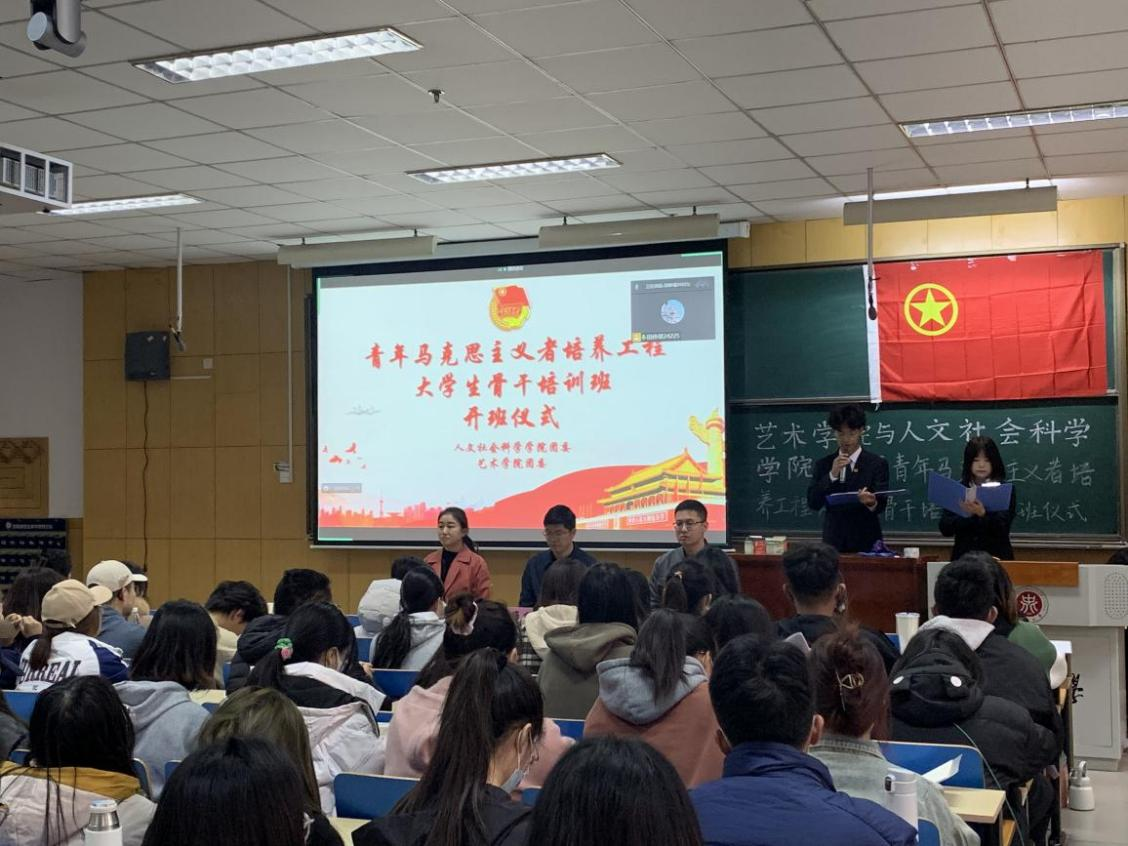 为进一步引导青年学生坚定理想信念,听党话、念党恩、跟党走,加强学生干部队伍建设,增强全体学生干部的素养、责任与担当。2022年11月5日、6日,艺术学院与人文社会科学学院青马工程培训班开班仪式隆重举行。艺术学院党委副书记田维飞、艺术学院团委学生会指导老师刘维佳、人文社会科学学院团委学生会指导老师乔洋出席仪式。