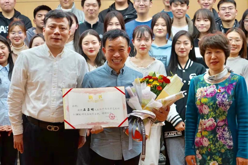 讲座的最后,由艺术学院王燕平院长,栗秀萍书记,共同为石占明老师颁发中北大学艺术硕士(MFA)校外硕士研究生导师聘书。