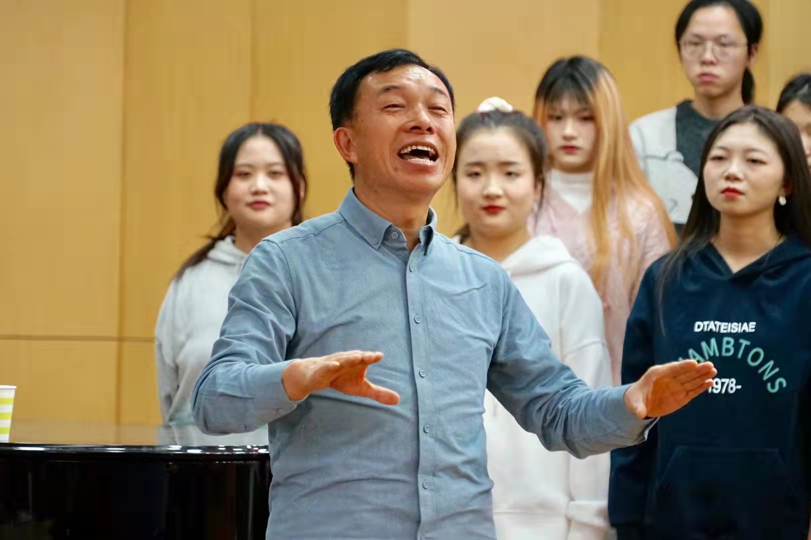 讲座中,石占明老师首先讲述了他是如何从一个放羊娃最后成长为“山西歌王”的经历。并以此激励并启发学生们,在声乐学习的道路中,舞台实践的重要性。尤其有着鲜明地域文化色彩的民歌,更要准确把握他的特点和内涵。其次石占明老师又谈到,山西民歌有着悠久和深厚的历史,实地碰触传统民俗文化的必要性。从教室中的声乐理论走向田间地头,切身感受山西民歌的博大精髓。石占明老师为使学生们能够更加直观感受山西民歌的魅力,现场为老师和同学们,激情演唱了山西民歌的代表作品,《一对对鸳鸯水上漂》、《亲圪蛋下河洗衣裳》还有自己谱写词曲的原创作品等。针对一些学生对左权民歌咬字方面的技巧,进行了示范教学。同时为我院合唱团的学生们,做了非常详实的现场指导。