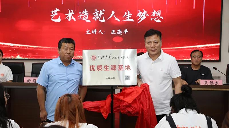 2022年7月11日上午,艺术学院党委书记栗秀萍,院长王燕平,院党委副书记兼副院长田维飞,教师教师代表刘维佳、柯枫,奔赴山西省繁峙县砂河中学,进行中北大学2022年本科招生宣传并与两校建立优质生源合作关系,举行了优秀生源地签约与挂牌仪式。繁峙县教科局局长助理范福龙参加授牌仪式。砂河中学党支部书记、校长尹月恒主持仪式。仪式上,双方领导沟通了中北大学艺术学院整体情况和合作方式,为砂河中学授“优质生源基地”牌匾,并签订了优质生源基地建设协议。