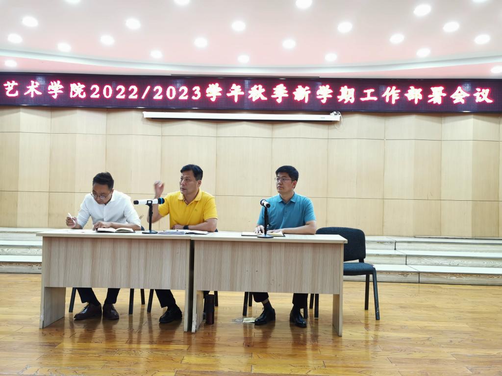 会上,王燕平院长全面总结了学院上半年工作和暑期工作完成情况,充分肯定了学院假期在产教融合、艺术展演、招生就业、暑期实践等方面取得的成绩,并对新学期就全面做好疫情防控、舆情监测、安全稳定、教学科研等工作进行了详细的部署。重点强调了新学期的工作计划有以下几个方面:一是要时刻绷紧政治、舆情、校园,防疫等安全之弦,共同筑牢校园安全屏障,疫情期间要确保高质量的做好线上教学工作;二是要齐心协力做好美育平台的建设工作;三是要公开、公平、公正的认真做好学院教师的定岗定级工作;四是要做好科研项目申报、比赛展演和教学成果的累计。