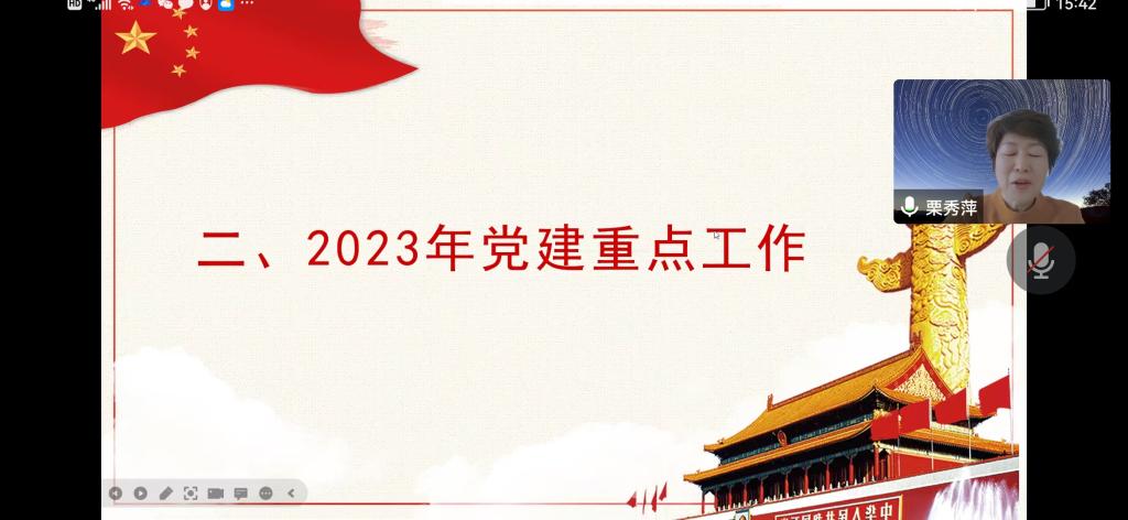 最后,院党委书记栗秀萍首先感谢全院教职工一年来为学院工作的辛苦付出,同时对2022年的党建工作进行了全面总结,并重点强调了四个方面的内容:一是要求全体教师完整、准确、全面学习领会党的二十大精神,深入理解内涵,精准把握外延,自觉用党的二十大精神统一思想、武装头脑;二是对2023年党建重点工作进行了部署安排;三是对本年度在疫情防控中做出贡献的教职工进行了通报表扬;四是提醒全体教职工在寒假期间提高安全意识,出门做好安全防护,做好假期值班工作。最后她指出:本年度虽受疫情影响,各项工作开展面临着巨大的困难与压力,但大家克服了重重困难仍然顺利完成了所有的工作目标任务,希望全体教职工将继续砥砺奋进,勇毅前行,以更加昂扬的斗志推动学院各项事业更上新台阶!