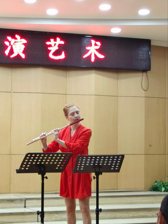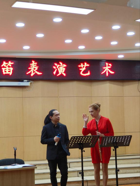 伊丽莎白老师首先介绍了长笛的历史与发展、理想的音色、合理的练习与演奏方法以及现代作品中的特殊技巧,包括弹舌音、泛音等。其次演奏了从巴洛克时期到现代的音乐作品,包括《泰勒曼长笛协奏曲》、《Qianligongchanjuan》、《Tweet》、《Final Demand》等,最后为我院长笛专业学生进行了指导。