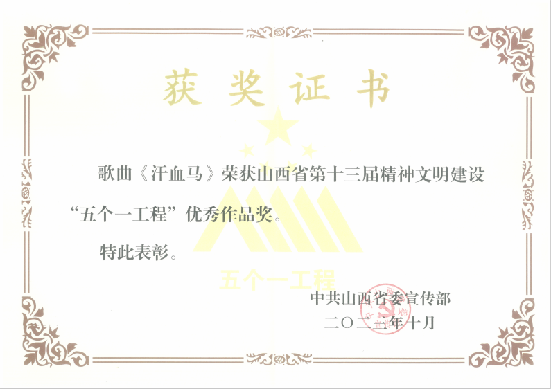艺术学院以弘扬中华优秀传统文化、革命文化和社会主义先进文化,体现正确的历史观、民族观、国家观、文化观为核心指导精神;为达到音乐塑造中华奋起之艺术形象,构建新时代、新征程文化的精神内核,艺术学院创作歌曲《汗血马》荣获山西省第十三届精神文明建设“五个一工程”优秀作品奖。
