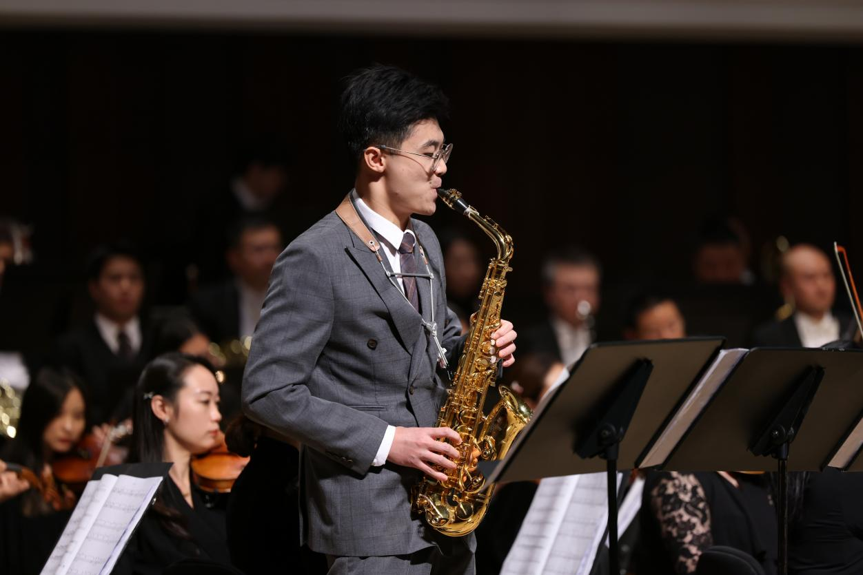 中北大学艺术学院青年教师张记晨博士受邀参加开幕式音乐会,与陕西交响乐团合作演出《太阳鸟的无穷动》(由四川音乐学院作曲系郭元教授为中音萨克斯管与交响乐团创作)。作品以十六分音符音型、震音式的音型为主要音响,以此来表现太阳鸟飞翔的状态。乐队以支声复调方式变化重复独奏萨克斯管的音型,模糊了音乐线条,虚化了音响轮廓,宛如伴随太阳鸟飞翔过程中产生的重重玄影和串串印迹,刻画出太阳鸟对太阳永不停息的追寻。音乐中对于中音萨克斯管复音、超吹等非传统技巧的运用,将乐器丰富的音色表现力展现得淋漓尽致,给人以耳目一新的听觉体验,萨克斯管极高音区强有力的长音,像一只扶摇怒冲而上的太阳鸟,一声竭力的嘶鸣划破天际,画面感很强,给人留下深刻印象。