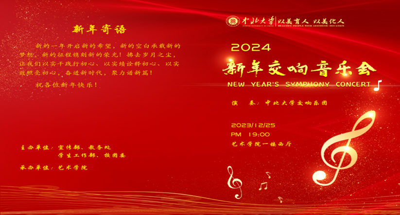 新的一年开启新的希望,新的空白承载新的梦想,新的征程镌刻新的荣光!2023年12月25日晚,中北大学交响乐团以“奋进新时代 聚力谱新篇”为主题举办2024新年音乐会,音乐会以通过精湛的旋律,渲染出中北大学在高质量发展下取得的成效,让我们以实干践行初心、以实绩诠释初心、以实效照亮初心,为冲击双“一流”奏响新的音乐华章。