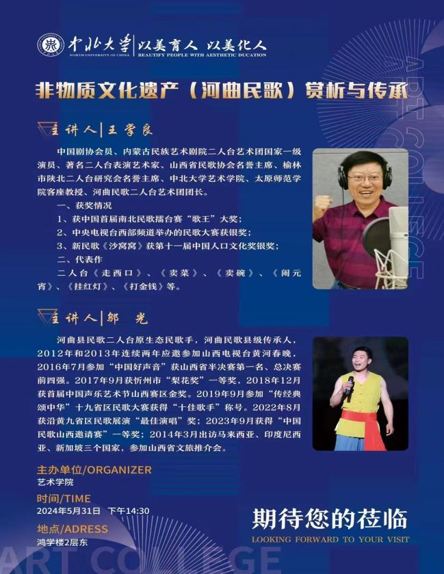 为深入探索非物质文化遗产的保护与发展,弘扬中华优秀传统文化,2024年5月31日下午14:30,在中北大学艺术学院鸿学楼二层东报告厅举办了一场别开生面的“非物质文化遗产(河曲民歌)赏析与传承”美育讲座。此次讲座旨在以美育人,以美化人,通过河曲民歌这一独特的艺术形式,激发师生们对传统文化的热爱和尊重。