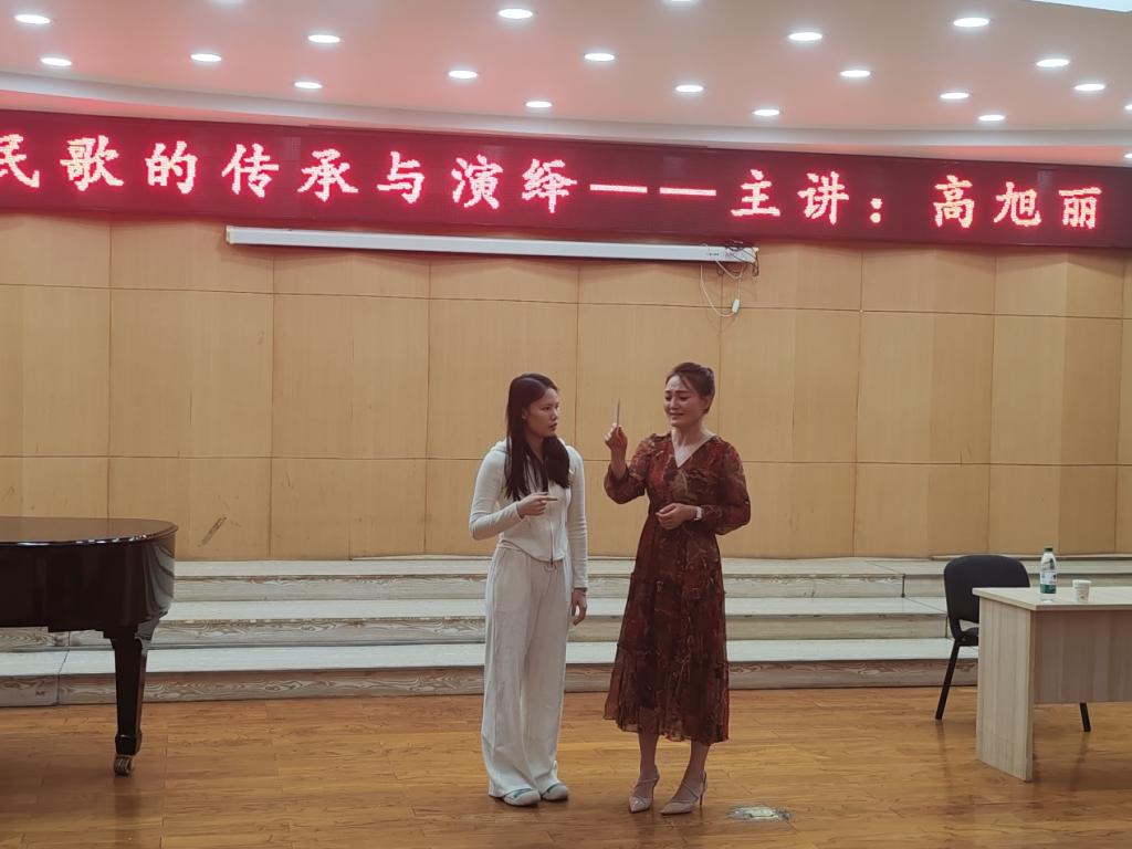首先高旭丽老师分享了在传承和发展山西民歌过程中的心路历程和宝贵经验。并强调,山西民歌是山西文化的重要组成部分,传承和演绎好山西民歌,对于弘扬中华优秀传统文化具有重要意义。随后高老师以其深厚的艺术功底和丰富的舞台经验,为现场的师生们演唱了《桃花红杏花白》《梦梦》等多首经典山西民歌。现场气氛热烈,掌声不断。