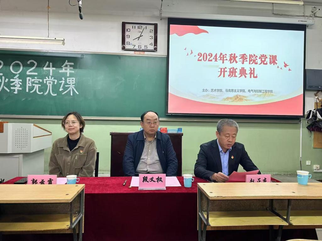 为深入学习贯彻党的二十大和二十届三中全会精神,扎实做好党员发展和教育工作,严格把好党员发展“入口关”,艺术学院、马克思主义学院、电气与控制工程学院于2024年10月19日和20日联合举办2024年秋季院党课。马克思主义学院党委书记段义权、电气与控制工程学院党委书记赵正杰、艺术学院党委书记郭云霞出席本次院党课开班典礼。