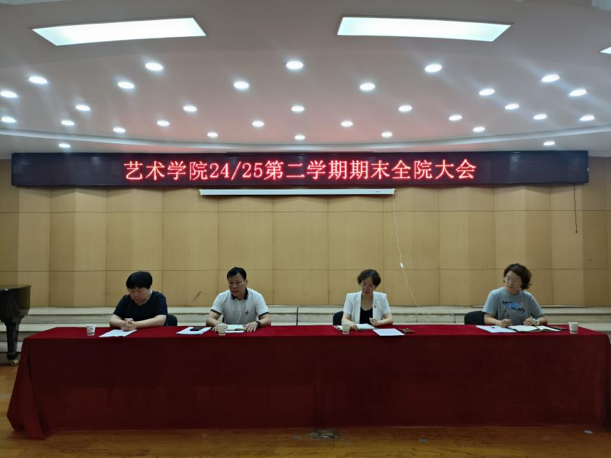 为全面总结本学期工作成果,部署暑期及下学期重点工作,艺术学院于2025年7月2日15:00在鸿学楼一楼东厅召开了2024-2025学年第二学期期末全院大会。会议由院长王燕平主持,学院领导班子及全院教职工共同出席了此次会议。