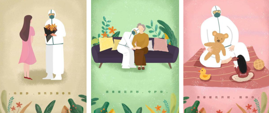 17120541班的高群同学,创作海报《护盾篇》。本作品以白衣天使抵抗冠状病毒为主题,展现了医护人员用手里的工具和人墙组成抵抗病毒的武器与保护罩,他们团结一致克危难、擒魔患,众志成城屹立天地间,保家卫国共度难关。他还创作海报《陪伴篇》本作品以爱与温情为主题,通过陪伴你/守护你/相随你的标题为线索,以孩子,老人,爱人为主体,展现医护人员生活中温馨的一幕幕,愿春暖花开时,有你在身边。