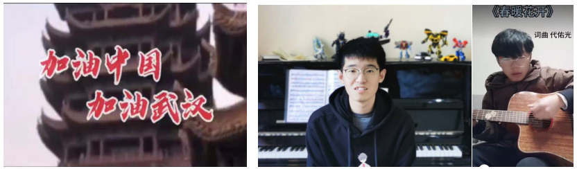 17120242班的张帆同学,创作歌曲《加油中国 加油武汉》。正如歌词所唱,“没有任何风浪可以击垮我们的坚强!没有任何困难把前行的脚步阻挡!”没有一个冬天不可逾越,没有一个春天不会来临。白衣英雄们用实际行动践行对生命的庄严承诺,用滚烫的赤子心化作人间大爱。英雄们坚定的初心和信仰正是学子们明天的责任与使命。18120242班的代庆鹏,创作歌曲《春暖花开》,送给疫情结束那一天的武汉,疫情结束那一天的祖国。他想给那一天取一个美丽的名字,就取名《春暖花开》。相信武汉的樱花会如期绽放,相信一切美好都会如约而至,武汉加油,中国加油!