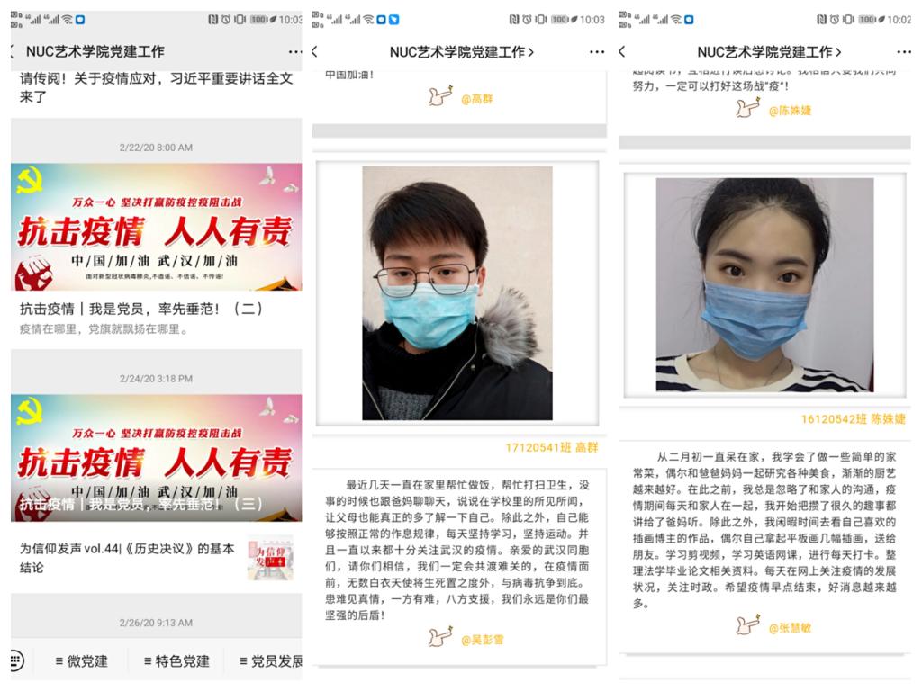 艺术学院本科生共有57名党员,自发组织发表组成57篇“党员说”,分享了疫情发生以来的日常生活记录。学生党员吴有磊同志跟随党的领导,积极响应党的号召,做到不出门不串门,作为一名学生,安心待在家里学习就是在为国家做贡献。赵雪静同志作为一名党员也在积极配合村支部的工作,以身作则的同时也负责监督村民履行好“十不准”,发挥了党员的模范带头作用。高红奇认为在面对疫情时,保持良好的心态和健康的身体是不可缺少的。他坚持每日运动,做到科学防疫,不信谣不传谣,及时了解疫情的发展以及如何防控;同时也向乡政府发送了志愿申请,希望能够参与到抗击疫情的行动中。