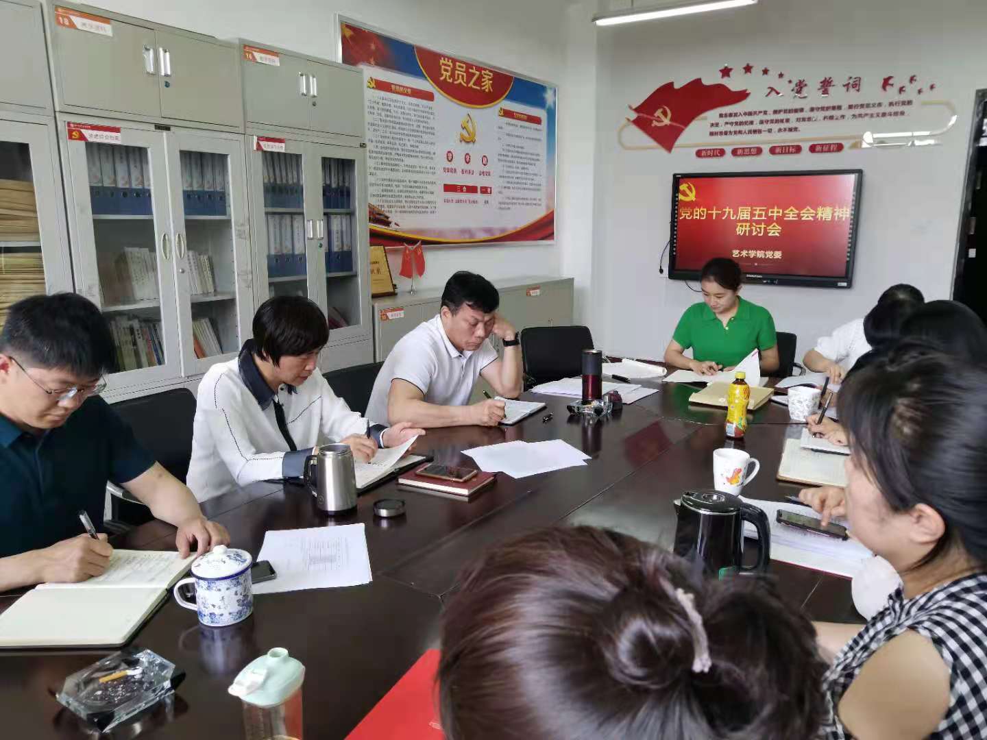 2021年6月1日下午,艺术学院党委围绕党的十九届五中全会精神开展学习研讨,党委书记夏瑞丽主持研讨会,党委成员、各科室负责人参加会议。