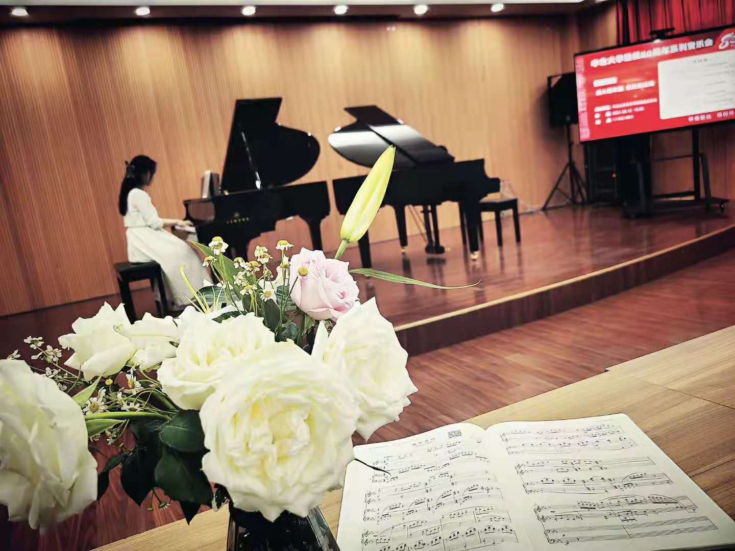 本次音乐会,内容丰富、形式多样。由张千寻,陈旭和等人带来的八手连弹作为开场,曼妙的旋律从她们的指尖流泻出来,给观众带来了完美的听觉享受。她们拉开了音乐会的序幕,也瞬间将音乐会的气氛推向高潮,曼妙的旋律从她们的指尖流泻出来,给观众带来了完美的听觉享受,12双手在黑白键上跳跃,精湛的技艺、娴熟的配合将钢琴“乐器之王”的魅力完美展现。铮铮琴音敲打着在场观众的心,声势浩大,慷慨激昂。音乐会结束后,同学们纷纷上台为老师们献花并合影留念。
