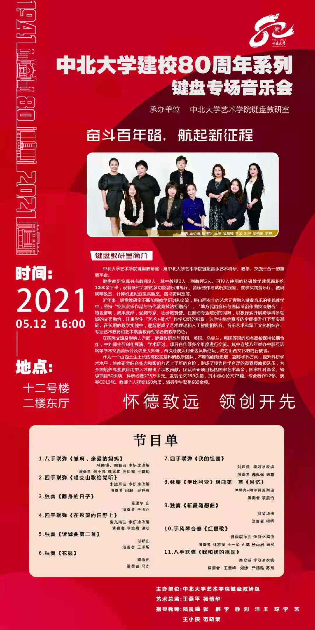 为庆祝中北大学成立八十周年,2021年5月12日,中北大学艺术学院80周年系列键盘专场音乐会在艺术学院二楼东厅成功举办。我院院长莅临音乐会现场观看演出。大家用一场精彩的演出展示了他们精湛的技艺。
