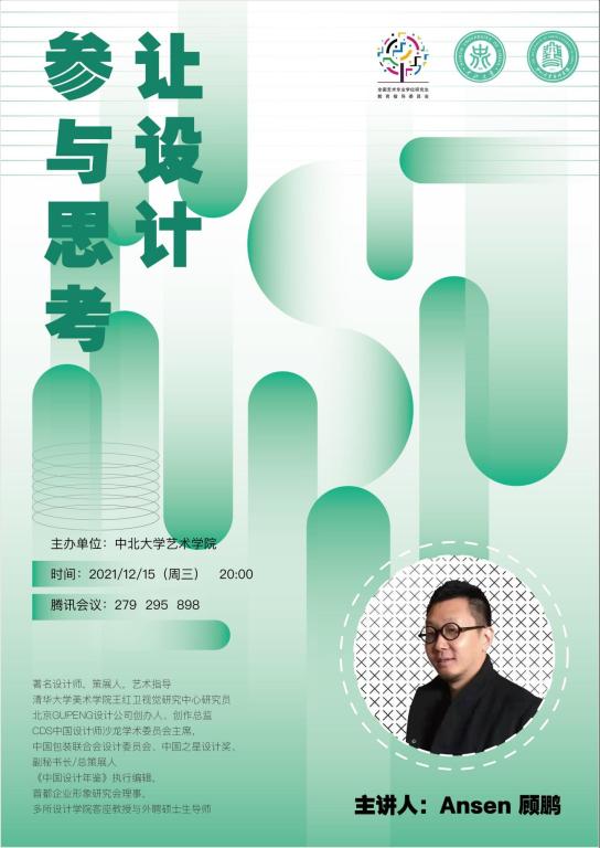 2021年12月15日20:00,中北大学艺术学院举办了线上主题讲座《让设计参与思考》。本次讲座由著名设计师顾鹏主讲。在讲座中,顾鹏老师从“设计师的定义”“专业”“悟道的道路”“动词设计”“以设计向社会发言”“交流也是一种设计”等六个角度,进行全方位的讲解,并通过大量实际案例的分享,让同学们从多维度了解设计的过程、设计的意义,以及市场向设计师提出的新要求。讲座尾声,顾鹏老师就设计师的天职以及如何塑造设计师的技能等问题进行了互动答疑,同学们受益良多、收获颇深。