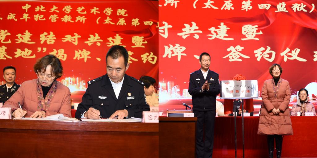 为充分发挥美育在塑造美好心灵中的重要作用,同时利用专业优势积极服务地方,2024年11月25日,艺术学院与山西省未成年犯管教所(太原四监)举行“帮教基地”揭牌、签约仪式,同时签订“党建结对共建协议”。省未管所党委副书记、政委李明文,党委副书记、总经理常晋民,艺术学院党委书记郭云霞、副院长杨博华及相关老师出席揭牌、签约仪式。