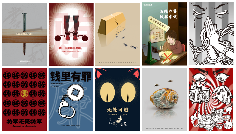 展览期间,驻中北大学纪检监察组组长贾维河、校纪委副书记郑智贞等领导亲临现场参观。此次展览汇聚了百余幅海报作品,其中涵盖以诚信应考、坚决拒绝学术造假为核心创意的主题海报,深刻彰显学术领域廉洁自律的重要性;亦有以“脚不能哪里都踏”“手不能哪里都伸”“房不是哪里都能住”“衣服不能什么都穿” 为系列的反腐倡廉海报,以直观且犀利的视角敲响廉洁警钟;更有以铁钉、苹果、蚂蚁、雨伞等独特视觉符号创作而成的隐喻海报,通过巧妙关联抽象廉洁概念与具体形象场景,使观众在潜移默化中领悟廉洁真意;还有图形突变的 “将军还是将军” 等符号海报,以别具一格的创意引发深度思考。这些海报的创意形式丰富多样、匠心独运,淋漓尽致地展现出多元创意驱动下对廉洁理念的深刻诠释与广泛共鸣。