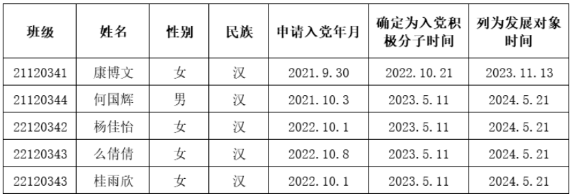 艺术学院本科生第二党支部于2024年6月7日召开支部委员会,经讨论、表决一致同意拟接收何国辉等5名同志为中共预备党员。现将5名同志的基本情况公示如下: