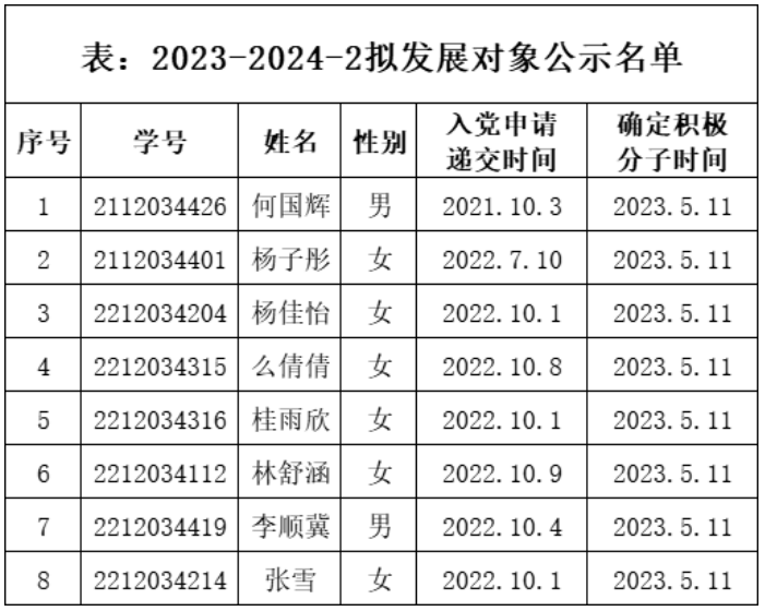 经党支部培养教育和考察,在听取党小组、培养人、党员和群众意见,积极分子量化考核的基础上,经支委会2024年5月11日讨论,拟确定何国辉等8名同志为发展对象。