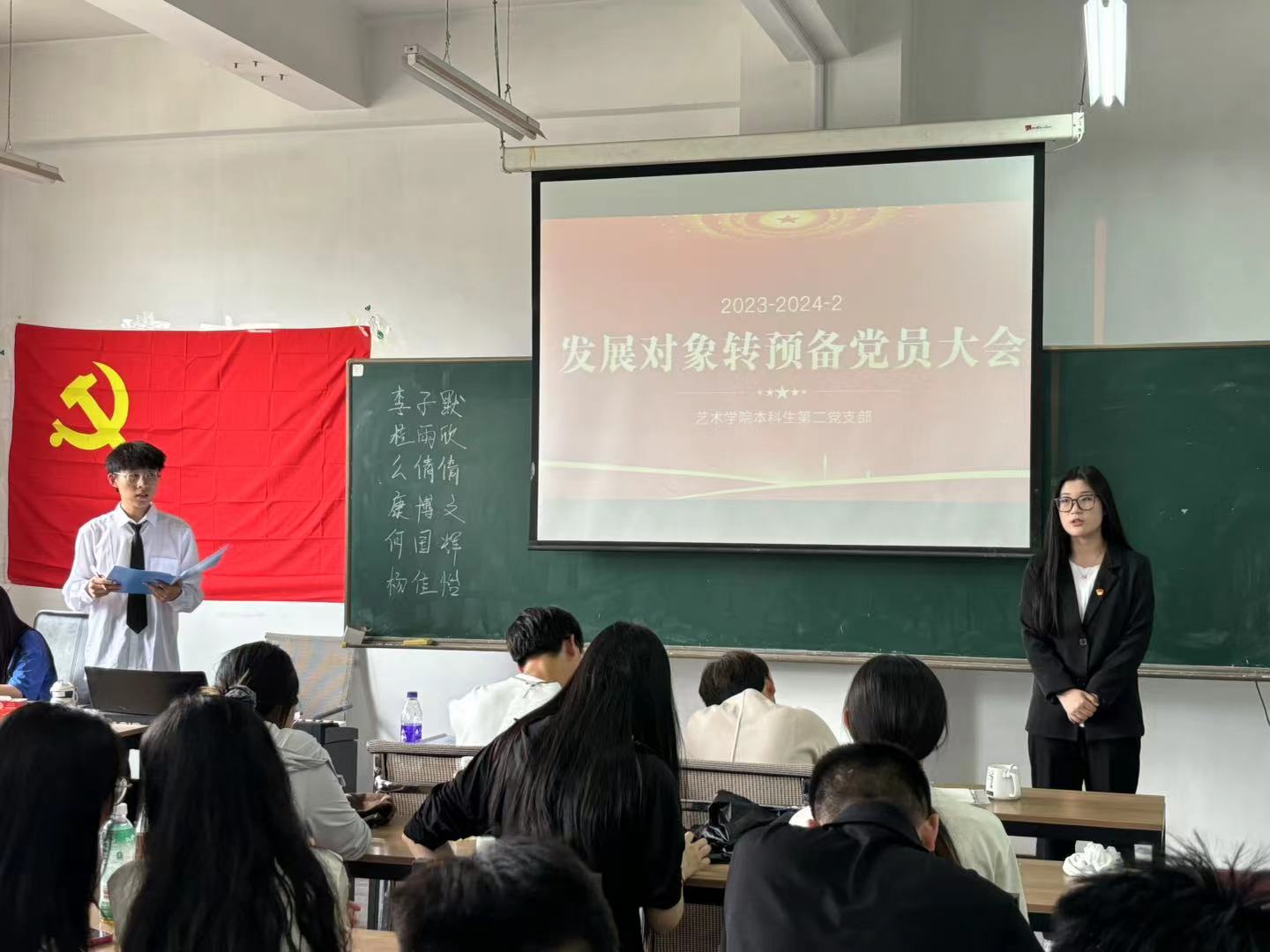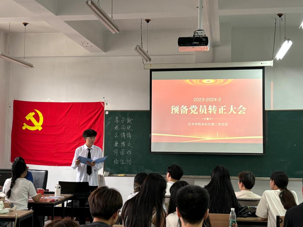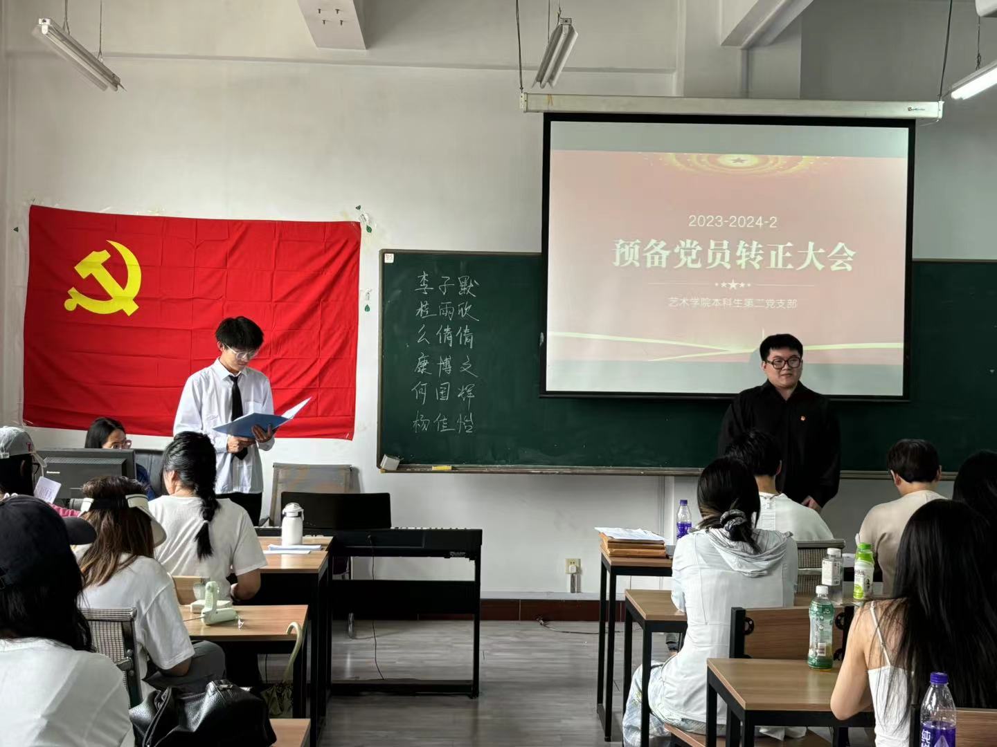 2024年6月20日下午4:00,艺术学院本科生第二党支部在09522H教室召开了支部大会。大会讨论了李子默1名预备党员延期满转为中共正式党员及接收桂雨欣、么倩倩、康博文、何国辉、杨佳怡5名同志为预备党员的问题。支部共有党员33名,应到33名,实到32名,未到1人。应到会有表决权的正式党员14名,实到会有表决权的正式党员13名。有表决权的正式党员到会人数超过应到会有表决权人数的半数,符合会议规定人数。