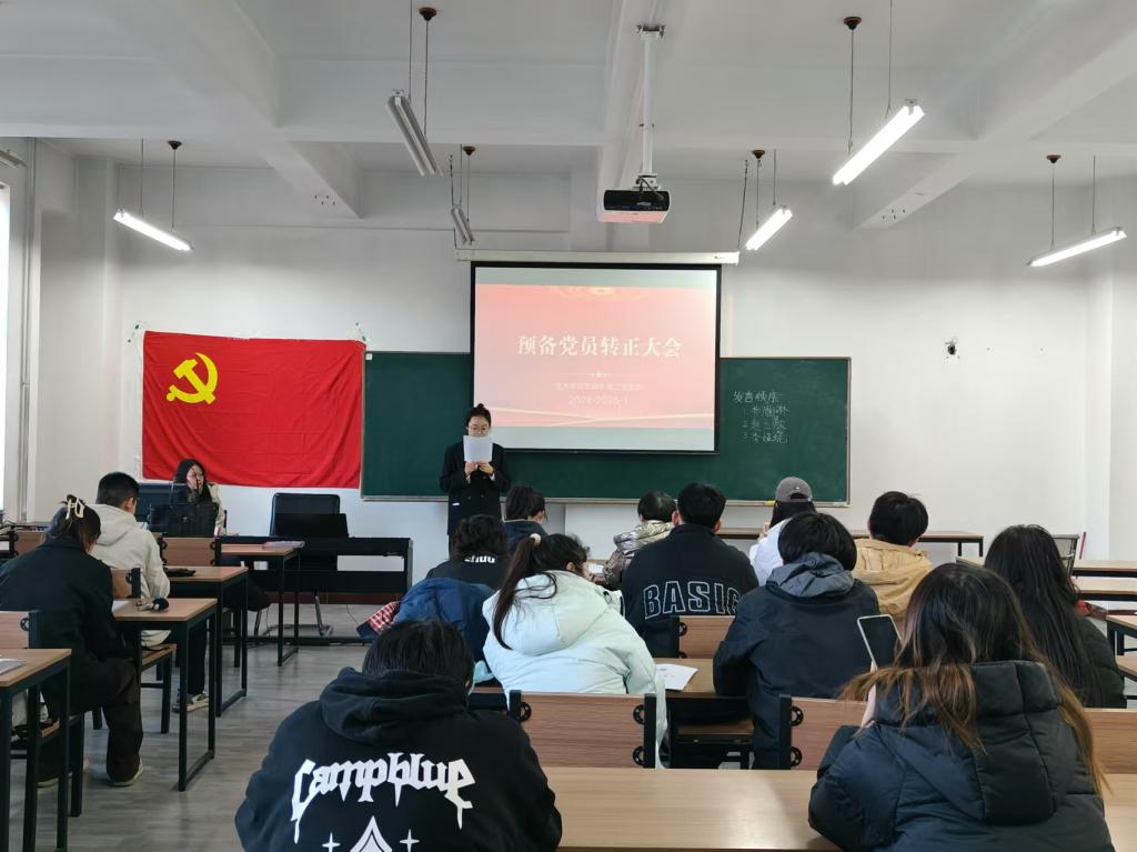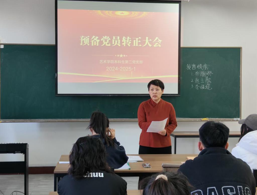 2024年12月30日上午9:00,艺术学院本科生第二党支部在09522H教室召开了支部大会,大会讨论了杨雁琳、赵玉欣、李娅妮3名预备党员按期转为正式党员的问题。支部共有党员14名,应到14名,实到13名,未到1人。应到会有表决权的正式党员6名,实到6名,有表决权的正式党员到会人数超过应到会有表决权人数的半数,符合会议规定人数。