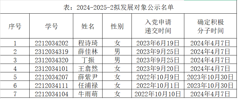 经党支部培养教育和考察,在听取党小组、培养人、党员和群众意见,积极分子量化考核的基础上,经支委会2025年4月15日讨论,支部拟确定程诗琦等7名同志为发展对象。
