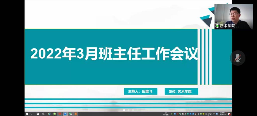 春风送暖日,扬帆奋进时。为明确新学期学生工作要求,强化线上线下灵活管理模式,提高德育工作实效,艺术学院于2022年3月14日上午9点30召开3月份班主任工作例会。会议由学院党委副书记田维飞主持,全体班主任、辅导员参加会议。