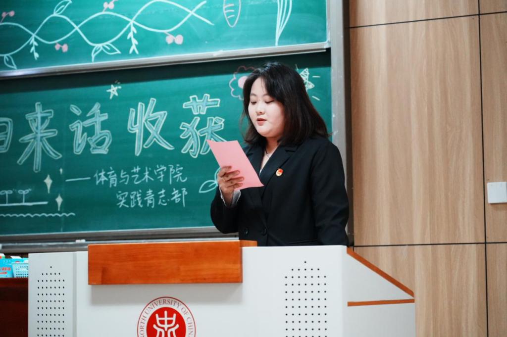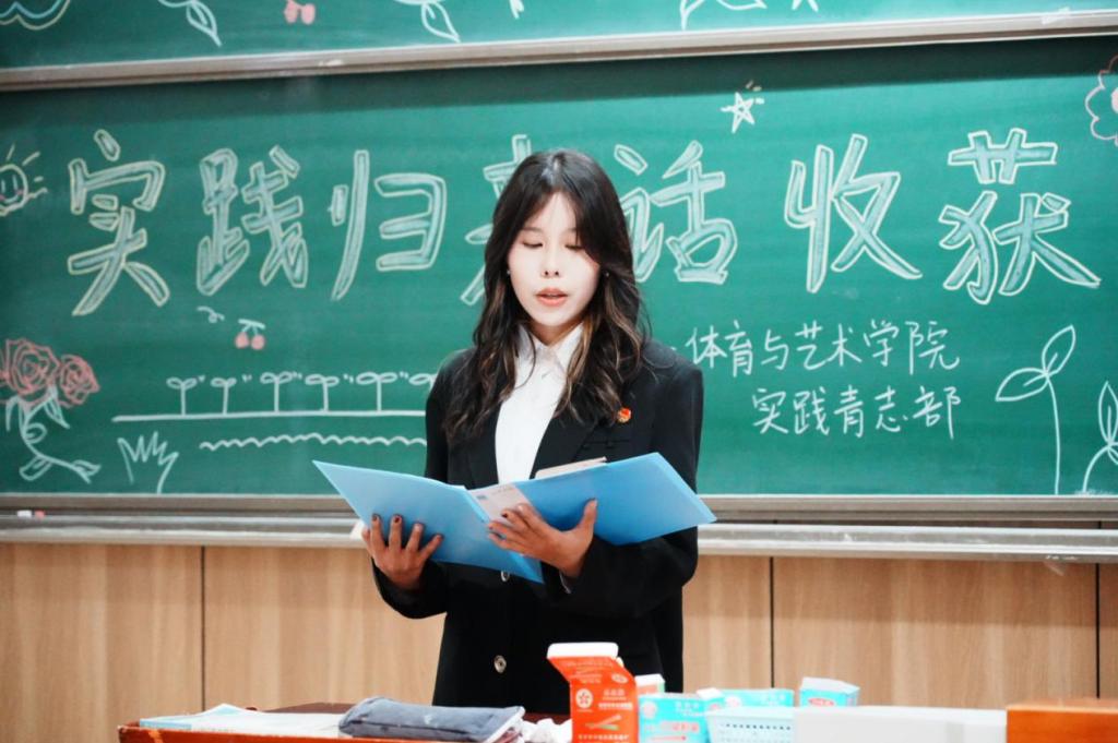 接下来是来自艺术学院暑期社会实践“扬帆起航”团队代表发言。通过生动的案例,展现了团队合作在实践中的巨大力量。她分享了如何有效地协调团队成员,发挥各自优势,共同攻克难题的经验,为在场的团队领导者和成员们提供了宝贵的借鉴。